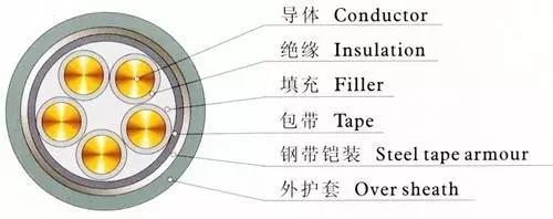 根据适用场合的需求不同,会在这个基本机构上添加其他的层面,比如需要增强电缆的机械强度和耐腐蚀强度,则需要在绕包层和外护套之间添加钢带铠装。